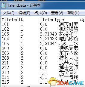 首先打开MOD的天赋文件即tale of wuxia》Mods》1.0.3.1》config》textFiles里的TalentData.txt