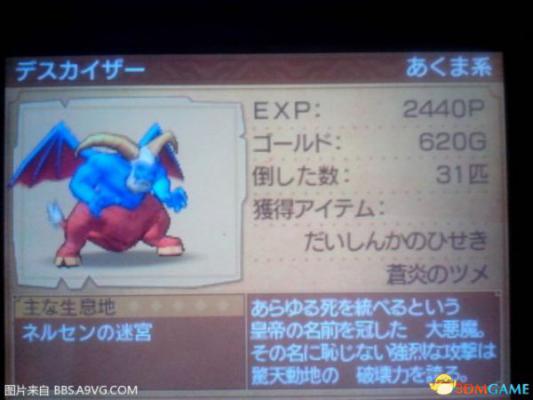 6,だいしんかのひせき 最强武器的合成素材,在试练迷宫里面打デスカイザー,具体哪个迷宫里面忘记了,记得场景是在雪地的森林里面遇到,同样用偷盗的方法。怪物长相如图下: