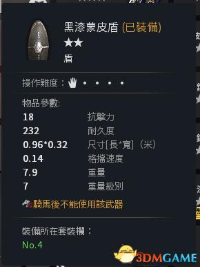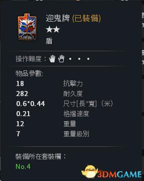 二星装备,防御力较高,覆盖面积较大,格挡速度略慢