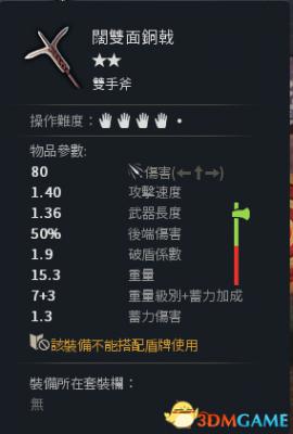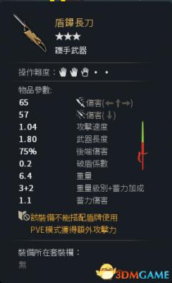 有PVE攻击力加成,具有盾刀类武器的全方位格挡功能,攻速快,较长,无法下刺