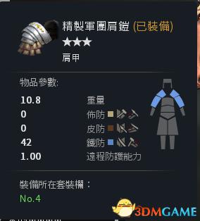 No.4 精制军团肩铠,三星装备,防御力高,作为罗马肩甲可上马,获取方法:每月首充礼包