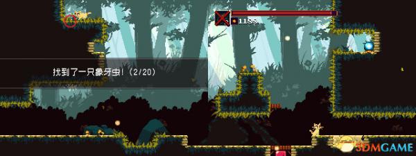 (4) 「极冷的萨丽尔」区域入口(第叁存档点下方)中间有个红色转换线,通过转换线时会切换到不同区域(神圣森林↔萨莉尔)。从萨莉尔区域离开时通过红色转换线切换到森林区域,然后往回走,在左边死路的地上就藏着象牙虫。