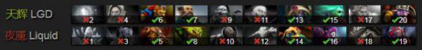 33分钟,双方中路开团,LGD先手秒掉了死灵法师,但是已经交掉了所有技能。随后装备优势非常大的水人收割。团灭了LGD。随后经济、装备大幅度领先的Liquid进攻LGD上路高高地,面对打不死的水人。LGD打出GG,Liquid拿下第一局。