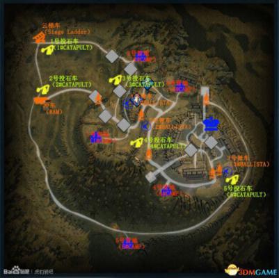 开始进入第2阶段。1号门破的时候,对面肯定占了一门口的兵,你可以让后方队友用投石削掉,当然最主要的是占营地,1号营地和2号营地占了,对面就失去了持续攻击的能力,推车杀兵也就很快了。总之,2阶段主要还是推车,兵不用带,放1号营地和2号营地中间的城墙下面。云梯车推到头尽快占了3号营地,运气好可以开门,运气不好也可以让守方多走一截路,或者被牵制一部分兵力。