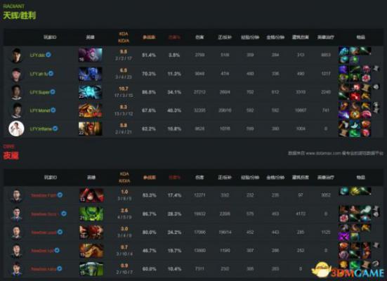 从BP开始双方就斗智斗勇,NB放出了夜魔和土猫在LFY选择了夜魔后自己前两手拿到了土猫和血魔,LFY则是在之后拿到了蚂蚁和美杜莎,NB没有办法最后一手祭出了火枪,从阵容上就可以看到LFY的头非常硬对面有血魔依旧拿出了蚂蚁。