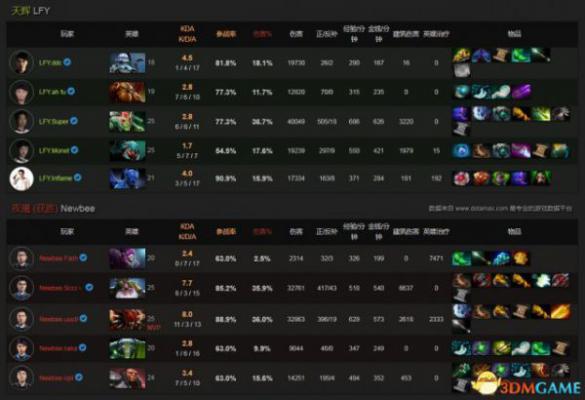 12分钟夜魔带队开5击杀了无解肥斧王和赶来的暗牧,不过2分钟后斧王就拿到了跳刀立刻配合队友河道击杀了前期完美节奏的夜魔。比赛来到16分钟双方的第一次团战,NB选择了血魔大招扔给美杜莎斧王跟上跳吼,无奈开出刃甲的美杜莎让NB很尴尬,LFY直接冲脸一通乱拳击杀NB四人将蚂蚁经济一波打了回来之后LFY瞬间收掉了肉山开始占据主动。之后就是LFY的压制和NB的高地麻将,比赛来到23分钟受不了的NB一波5冲了出来斧王先手到蚂蚁直接带走两条命不过火枪也被留下。之后2波团战LFY占据优势不过在28分钟LFY强行推进中路2塔自以为非常肉的美杜莎被NB的技能直接秒掉,又追死了巫妖让NB缓了一口气。