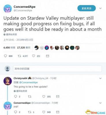 ConcernedApe强调本次包括多人模式在内的更新是免费的,所有购买了《星露谷物语》的玩家都可以获得。多人模式将先行登陆PC平台,之后登陆其他平台。