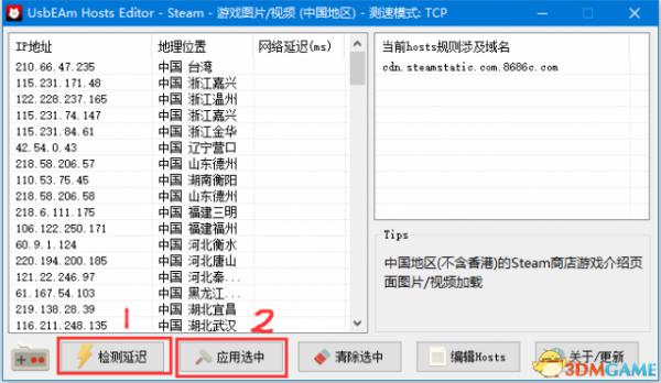 ③、根据上图选择一个具体的steam端口后,点击下图的“检测延迟”;选择一个较低延迟的ip地址;点击“应用选中”