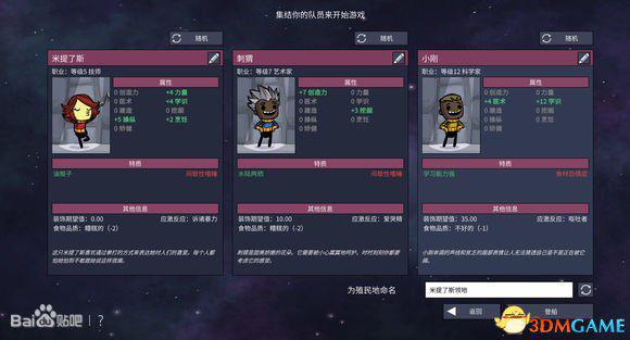 游戏开始会让你先进行开局角色选择,可以选择的项目为角色,角色姓名(自行更改),属性,正面特质及负面特质以及其他信息。进入游戏后每三天也会在传送门处提供一个新角色的选择机会,但是新角色的自带属性是无法进行随机刷新的,因此开局三个角色的选择尤为重要。