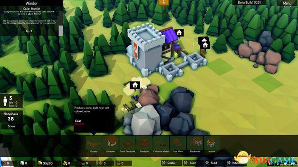 随便选两块树林砍伐,用获取的木头建第一个采石场,要求附近连通道路所以先从大本营牵一条道路出来,再紧挨着可开采石材(白色石头)放一个采石场。