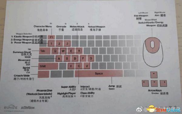 按键 说明 F1 角色菜单 1 动能武器 2 能量武器 3 高能武器 Q 手雷 E 近战武器 R 填充子弹 Tab 召唤光灵 WASD 移动 Shift 冲刺 Ctrl 蹲下/冲刺中滑行 X 凤凰滑翔(破晓术士专属) C 高亮玩家 V 职业能力 F 大招 G 互动/调查/对话 空格 跳跃 鼠标左键 射击 鼠标右键 瞄准 鼠标滚轮 切换武器 方向键 做表情