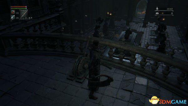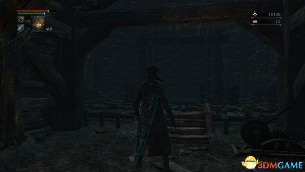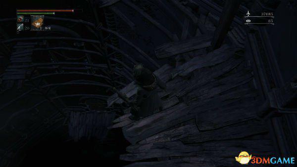 3.回到大教堂区往右边走,上电梯后过桥有个高塔,一直往下走,按图跳下去(记得是冲刺跳,不是滚。建议血多裸奔)开起门到达废弃旧工厂,这里有木偶套装、古老猎人骨头和第三脐带