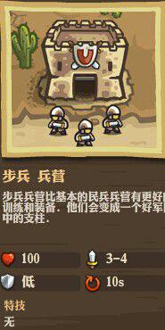 最基本的兵营,随着升级士兵会从民兵变为骑士,基础能力不错但是没啥特殊技能,基本上就是挡路的炮灰的意思。