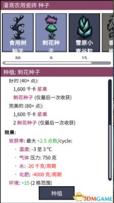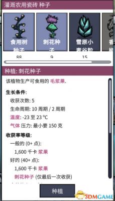 注意看图中的“收获率等级”,对于刺花来说,必须达到“好收成”才会产出一个种子,如果想扩大种植规模就需要“完美收成”才能获得2个种子。