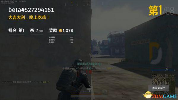 如图,拿了第一就会显示“大吉大利,晚上吃鸡!”