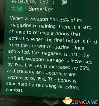 当一把武器只剩下弹匣中的25%的弹药时,有50%的几率在最后一发子弹发射时激活一个额外的加成。加成被激活后,弹匣会被立刻装满,武器伤害增加15%,射速增加25%,并且稳定性和精确度会降低15%。额外加成会被换弹或离开战斗取消。