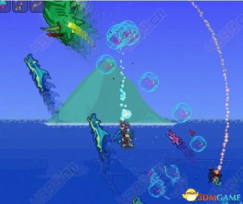 2.猪鲨公爵悬停在空中,对玩家释放泡泡。泡泡可以追踪玩家,接触到玩家以后对玩家造成伤害。泡泡可以被任意攻击打破。