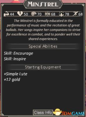 与前三个角色一样,吟游诗人也是初始角色,如果说铁匠和猎人是物理输出的两个对立面(高伤害低速度;低伤害高速度)(注意!事实证明铁匠和猎人也可能是魔法伤害的输出者,这取决于他们装备的武器),那么学者和吟游诗人则是魔法输出的两个相交面(高额的伤害,多样的属性;较低的伤害,但是大多在完美攻击时可以无视魔抗,大量的弱化技能),两者的伤害只有到了后期才有质的差别,但实际上在旅途中两者都是相当完美的帮手,如何选择则需要根据个人需求。(不建议选择一个以上的魔法输出,一是大部分怪的魔抗极高;二是法师的装备只会增加魔抗值而非护甲值,在后期法师很可能会被物理怪两刀劈死,但是战士能够凭借高护甲值抵挡攻击,猎人则能闪避大部分攻击,法师被连续集火乃至死亡的概率较低。而当有两个法师时,由于吸收和躲避攻击的能力变差,变相等于你受到的物理伤害增多了,这无疑会增加你的游戏难度。)