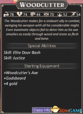 天赋技能1:高级破门,提升破门的成功率。地牢里必有的推门场景,伐木工可以不使用专注值就以极高的成功率破门。