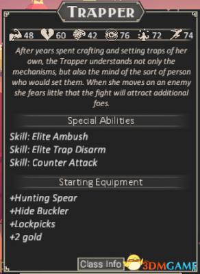 天赋技能2:高级陷阱躲避,提升躲开陷阱的成功率。几乎没有卵用的技能,因为即使猎人越过陷阱,同行的其他人并不可能轻易越过陷阱,这时往往的选择是解除陷阱而非越过。