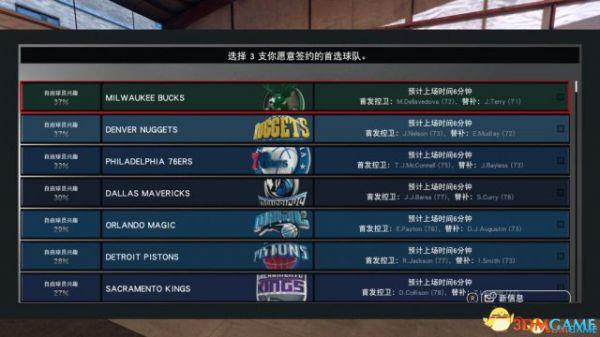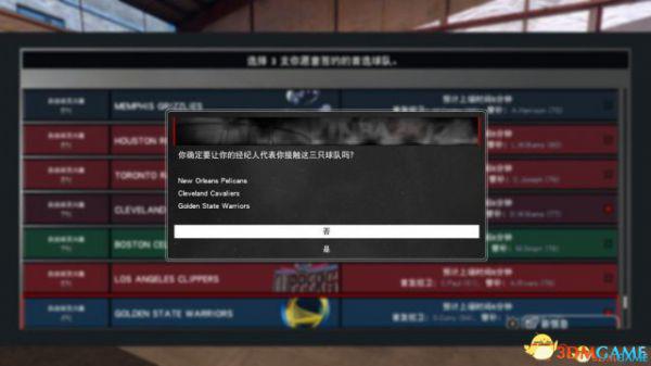 4、在出现的菜单中选择三支你想去的球队,必须要三支,可以选一个其他两个随便选。楼主此刻选的骑勇鹈鹕,抱大腿啊