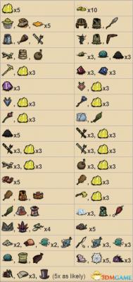 ③3个金块的情况下(概率六分之一),以下物品组合随机出现一种: