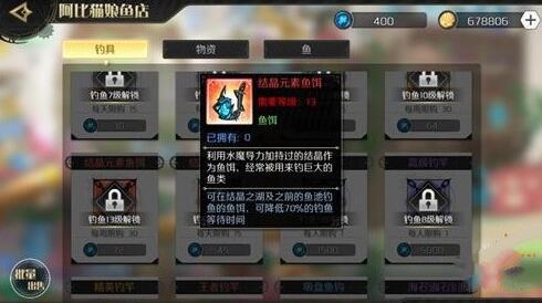 另外钓鱼用的渔具也是可以提升一下的,虽然渔具不能提升钓到高级鱼的几率,不过能缩短钓鱼的时间,加快效率,让大家有更多的机会来钓到捣蛋鱼。
