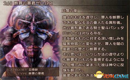 入手方法:神都的主线剧情结束(裁判被打倒)后,在神都ブルオミシェイス|Mt.Bur-Omisace的神殿门口,从キルティア教长老那里可以获得:断罪の魔石;然后在ミリアム遺跡|The Stilshrine of Miriam的“具眼の守護”大厅中的传送台上使用魔石,即可进入新的场景:秘する神の御所,里面就是断罪の暴君ゼロムス。这场战斗封印魔法,场地有连绵不绝的骷髅怪,难度较高。 骷髅方面以强攻为主,可以装配回避率高的盾牌,召唤兽以比率伤害魔法攻击为主,请保持较高的HP水平。撑不下去的时候可以发动必杀技暂时清场骷髅。