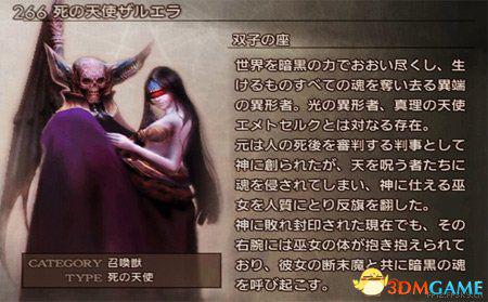 双子座 闇の異形者:死の天使ザルエラ,为右臂融合了巫女的骷髅形态召唤兽。获得方法十分烦琐。他能根据敌我的HP剩余量展开攻击或回复。攻击招数虽然少,但是非常强力,尤其是召唤技不需要时间耗尽就可能发动,对于剩余HP9999以下的敌人(持有自动能力“被ダメージカット”的敌人为6999以下)更是一击毙杀;专用即死特技“キル”对于没有“セーフティ”能力或者不是魔法防御状态的敌人也是秒杀,BOSS战以外还是很有效果的。