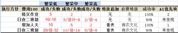 AI作业时一般选择 精实作业,如果有特技,则是增加人夫,这种规律形成应该是AI优选100%成功率决定的。