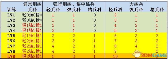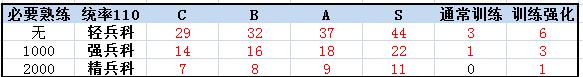 训练 设施强化 小10 中15 大20 强兵时设施总和/2;精兵时设施总和/4。
