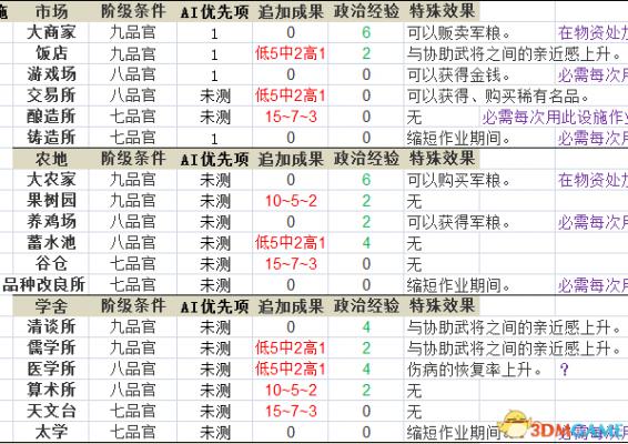 可以获得金钱/军粮(必需每次用此设施完成作业后才会获得资金(大概64~143左右),获得资金与政治无关。 )