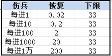 伤兵恢复=33+(伤兵*2%);(伤兵*2%)结果小数点不计,最小1。