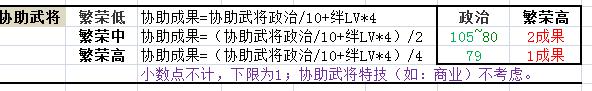 协助武将 繁荣低 协助成果=协助武将政治/10+绊LV*4 繁荣中 协助成果=(协助武将政治/10+绊LV*4)/2 繁荣高 协助成果=(协助武将政治/10+绊LV*4)/4 小数点不计,下限为1;协助武将特技(如:商业)不考虑。