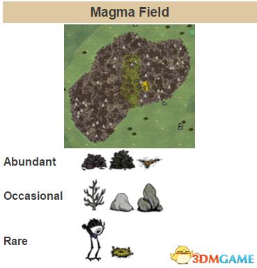 岩浆地形地面上会找到燧石和石块,岩石量很丰富,但小树枝不太常见。