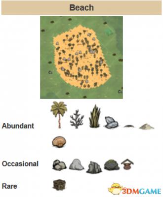 在玩家开始游戏时,沙滩生成于船的碎片附近(near broken pieces of a boat)。是前期非常好的地形,有玩家前期所需要的所有种类的资源。