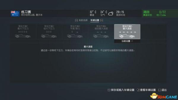 在开赛之前,你可以按回车键选择五种预设的车辆设置中的一种。另外你还可以调整滑块来更改这些设置。更改设置以后,按F2键保存设置。