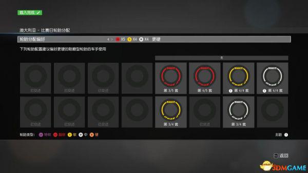 轮胎类型分为了特软、超软、软、中、硬。