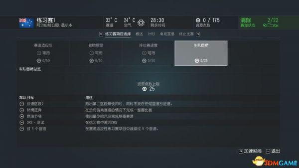 排位赛速度——排位赛速度练习项目是检测出你跑完一圈的最速圈用时。赛车会装载少量燃油和最快速的轮胎,来模拟排位赛的环境。你将有三圈机会来跑出最快用时。车队会根据你在测试中的表现,准确估算出你在周六排位赛中应该争夺第几名(目标21位)。