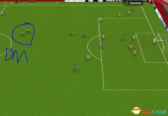 他既可以分给三个后卫中有空档的,也可以自己带几步,或者给到AMC。由于AMC有两个,加上前锋我设置了跑位飘忽的影锋,所以DM传球成功率极高,失误可能极低。