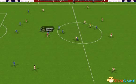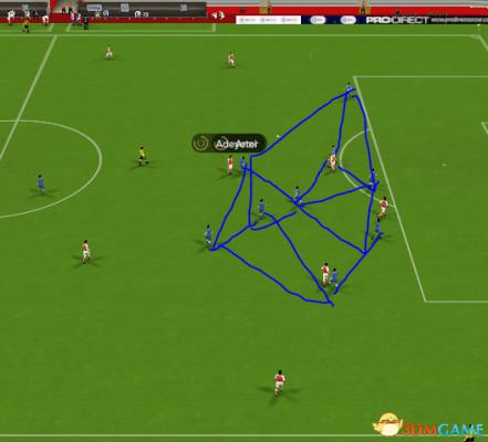 这一张则是对方前锋接球准备反击,可以看到蓝方已经在中路形成了严密的防守,而红色的可能出球路线只有一条是可能的,但这时由于AI即时计算触发,蓝方由于大量队员包围,其抢断性能大大提升。
