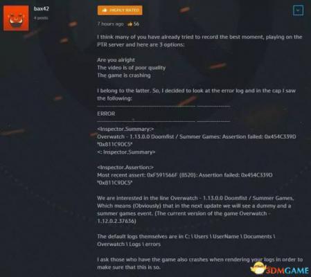 口说无凭,他还晒出了服务器崩溃后他查看到的错误信息日志截图,截图显示了这样一串字符:Overwatch - 1.13.0.0 Doomfist / Summer Games: Assertion failed: 0x454C339D "0x811C9DC5"。