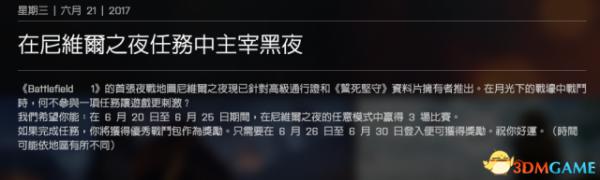 小任务:在6月20日到25日期间,在尼维尔地图获胜3场,就可以得到一个优秀的战斗包。