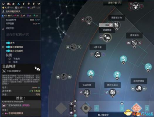 这是每个文明都会遇到的问题,单靠科技盘左边两个殖民数+2科技,撑不了多久。当然我们可以选择灭了其馀文明的母星,将所有路过的星系连根拔起,统统不要,但这样不够爽快啊!凭什麽我虫群大军硬要塞在12个迟早耗尽的星系里?那麽,请看看科技盘左边T4那个「昆虫转译」,一舰一点满意度,什麽都不用想,疯狂造兵,虫族就该这样玩!