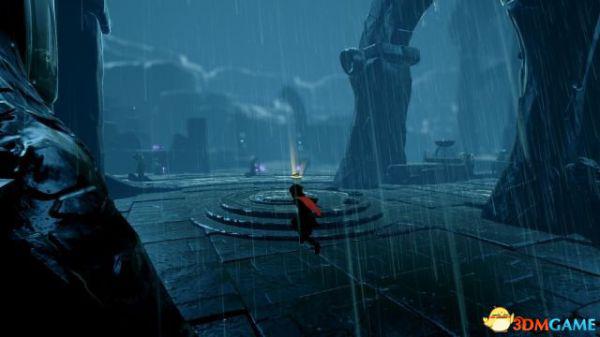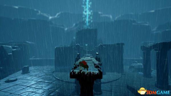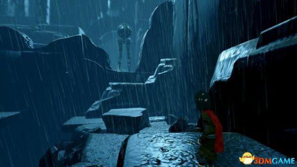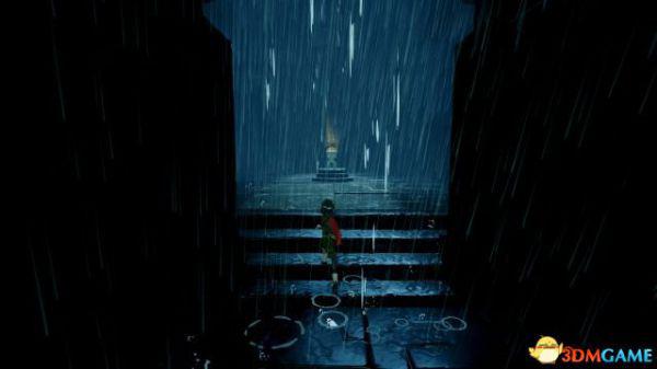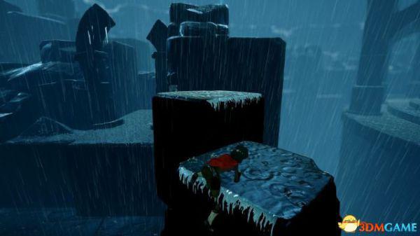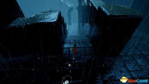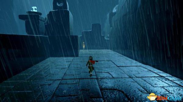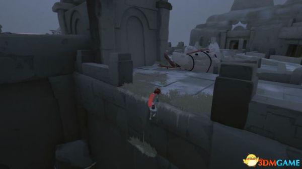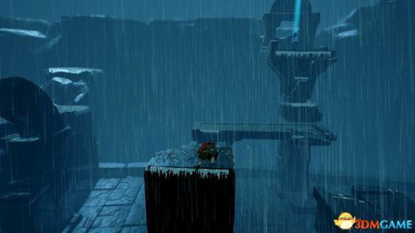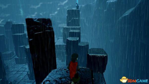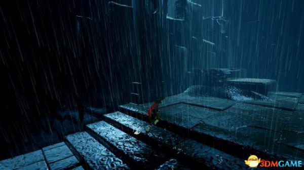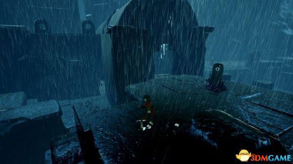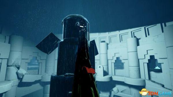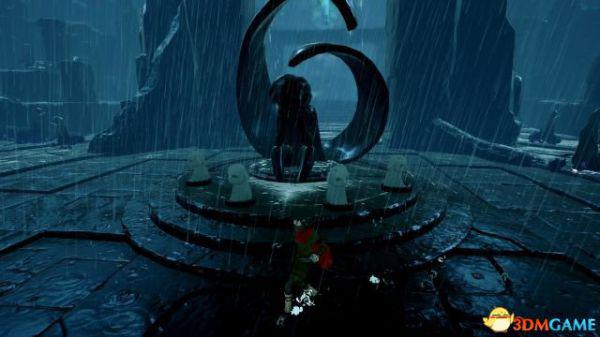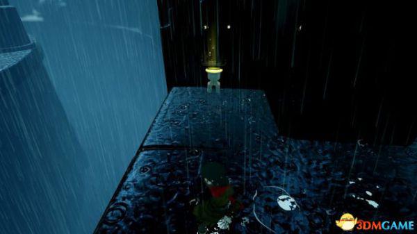 step7.继续逆时针走来到第二个小雕像前,你需要去到左侧(朝向小雕像)找到爬上高处的石头,接着去到远离小雕像的外墙上找到一个可以拉扯的装置,大量雨水会将倾斜石板变为倾斜朝向小雕像。