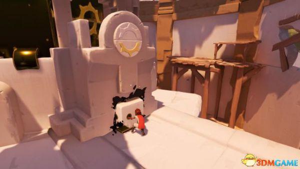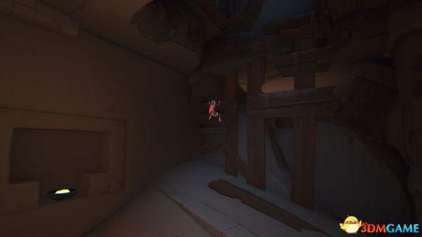 此时你快速走上即将闭合的台阶去到上层,途径匙孔装置,攀爬建筑物内部的木板去到上层,将一个台子推出去。
