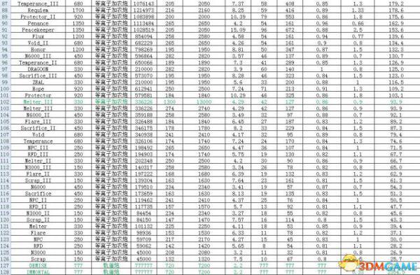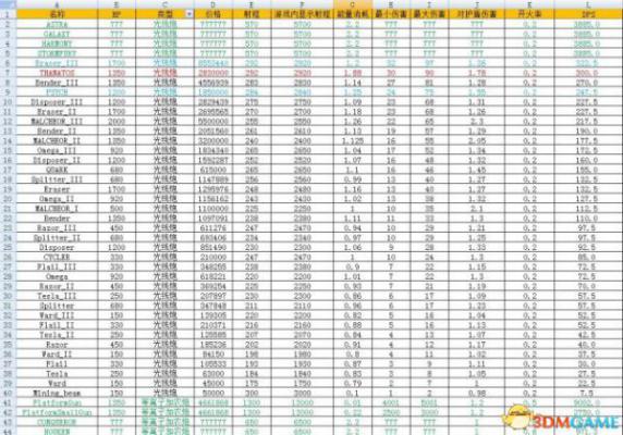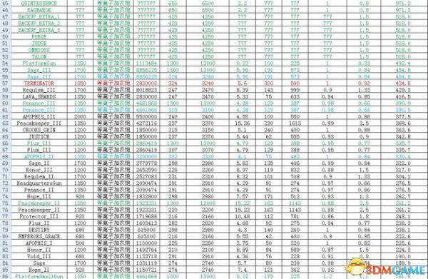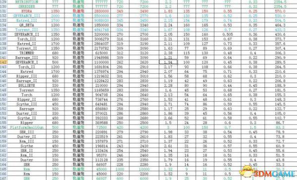 表格里,绿色字样的装备请无视,那是ai专用或者保留的数据;蓝色字样的装备是推荐使用的高性价比装备;红色字样的则是该种类里综合性能(考虑DPS等各种因素)最高的武器!