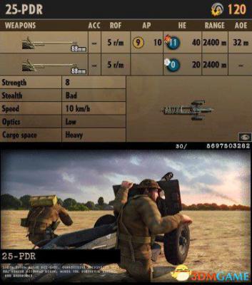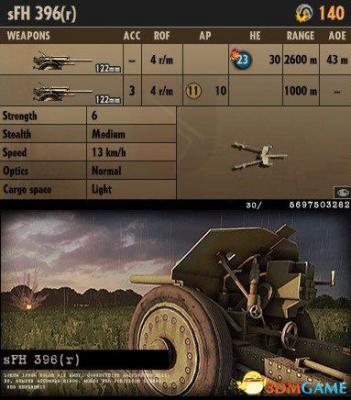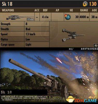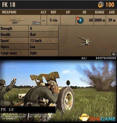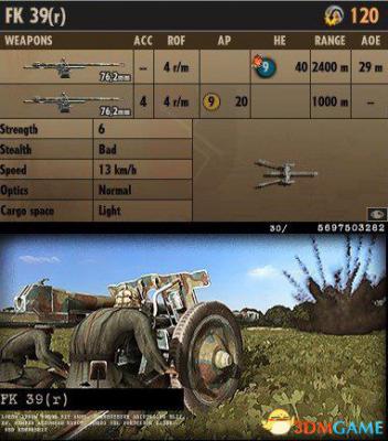 炮兵这里我分为野战炮(当然你也可以是说是榴弹炮,主要是德国野战炮和英国野战炮基本上从都能平射所以统称野战炮),火箭炮,迫击炮,地图炮和自行火炮。还是从基本数据开始,以下图FK39为例,从左到右的属性分别是(这里英文就不打了前面都有)精度,射速,平射时的穿甲能力,高爆威力,射程,爆炸范围。注意穿甲能力和高爆威力的黄蓝圈后的两个数字是载弹量。就是说FK39 76.2mm野战炮在曲射发射榴弹时,射速为4发/分钟(注意这个射速是包含了瞄准时间的),榴弹的高爆效果(不是单发而是一定时间内的造成的高爆伤害),射程为2400m,单发炮弹的伤害范围为29m(不得不吐槽某些电视剧炮弹不在裤裆下爆炸就炸不死人)同时备弹40发。而在平射发射穿甲弹时,精度为4,射速4发/分钟,在1000m上的穿甲能力为9(每100m穿深+1)同时备弹20发(这我就要吐槽了带这么多穿甲弹干嘛)然后是6人小组隐蔽性差速度13千米/小时,光学观察能力为一般,装载的体积为轻。同时单炮出场价120(不便宜)