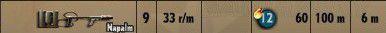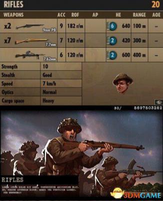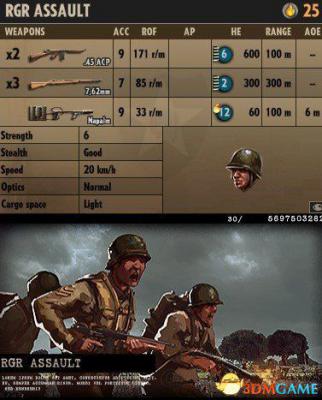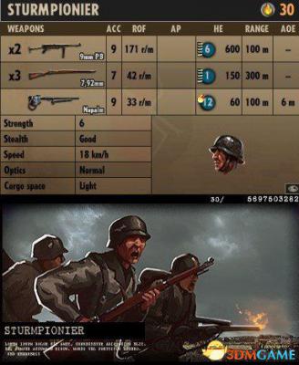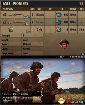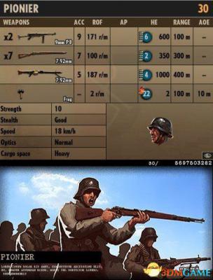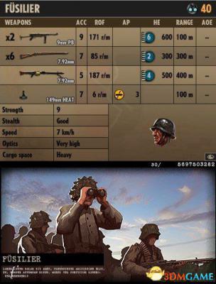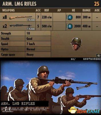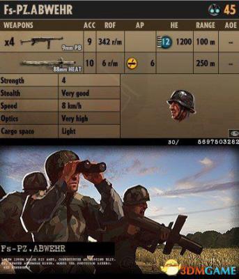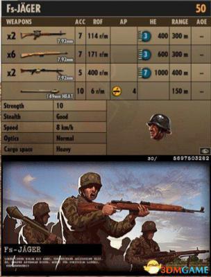首先是名称FallschirmJager(空降猎兵),然后右上方的50则这个单位消耗50点。下方的Strength为10就是这个班组有10位士兵。Stealth为Good就是有着不错的隐蔽能力,Speed为8km/h就是移动速度,Optics为Normal就是光学系统一般(发现敌人的能力一般),Cargo Space为Heavy就是装载的体积为重,这个指的是当这个步兵单位上载具的时候,只有对方的Transport Space大于等于Heavy这个步兵单位才能上对方载具(终于不是一个班15人坐着吉普车就上了前线)。那么从上到下是四样武器——1.步枪-FG42,2.步枪-G43,3.班组支援武器-MG34轻机枪,4.轻型反坦克武器-149mm火箭筒。武器面板从左到右分别是Weapon(武器),Accuracy(精度),Rate of Fire(射速), Armor Piercing(穿甲),High Exlplosive(高爆),Range(射程),AOE(溅射范围)这样就有了一个基本的了解。下面细化地讲一下。