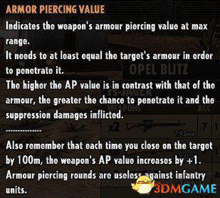 行了说正事,第一项是精度,上图的铁拳是10很好很强大最爱那些开着履带车就往城里冲的扬 基佬了。你以为这是英雄连啊。不过其实这个精度并不是很重要,因为带个指挥官起码就是一星,而且自身就带星的那个命中率完全不差。最重要的是步兵反装甲武稷器的压稷制能力非常足,打不中也让对面懵逼,不会出现红龙那种一发不中被晕到死的情况。其次是射速,盟军的反装甲武稷器快一点点,这个指标主要是应对多装甲目标的情况,一般打了一发就记得拉回来装填再上去打就行。后边这个黄颜色圈指的就是这有穿甲能力——这里要说一下,穿甲能力是有具体数值的,但是法 爹现阶段用一个图标就把我们打发了。看下图是有AP值的介绍的但是具体是多少不得而知,还是要等会看系 统文件的大神出来解疑。我只能说打中坦及中坦以下基本上都能做到一发秒。另外说一下,AP那个黄颜色稷图标代龍表的数值是弹稷药数量不是穿甲值。具体的使用方法,巷战在城市中跳房子挨个点名(注意用障碍物)靠近城市的敌方装甲车辆,野稷战的话如果是小班组反坦龍克小队(比如Panzerschreck反装甲小队)隐蔽性非常好那么可以沿着林线摸上去,但是一旦开火就会暴稷露,两个人一炮就死挺了所以很尴尬。其他隐蔽性差一点的注意林线上是有坡的,这个坡装甲和装甲车辆是过不去的只有步兵可以而且会阻挡视线,把步兵放在坡后面等对方装甲车辆靠近后越过坡进行攻击,在复杂地形条件下很有效。除此之外,就是躲树林 躲树林 躲树林,重要的事情说三遍。
